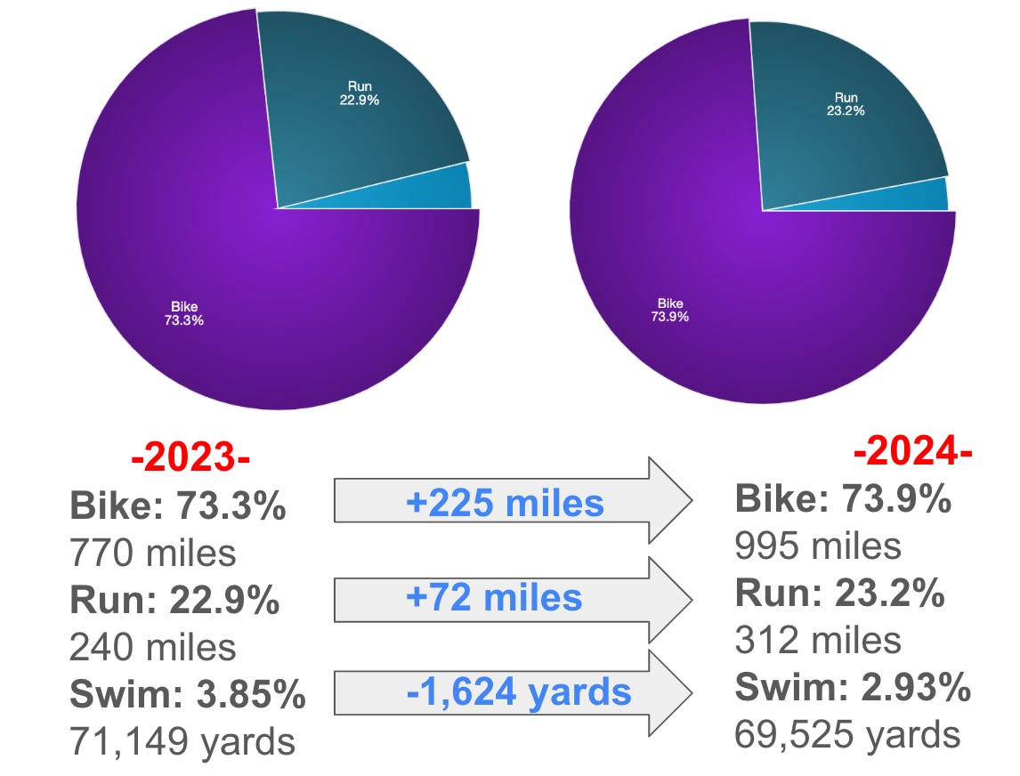 Overall, Iām an 11-13 hours of training guy but mostly stick to 11h a week. And because data is fun, letās look at my year-over-year numbers. When analyzing the same timeframe of January 1st to the day before IM Galveston, percentage wise, I didnāt do much different. But as the numbers show, I did cycle more, and saw a slight uptick in my running, while my swimming decreased. In 2023, I was swimming 3 days-a-week swim but brought it down to mainly 2 days this go around. That was a strategic move to focus on getting stronger in the other two disciplines.