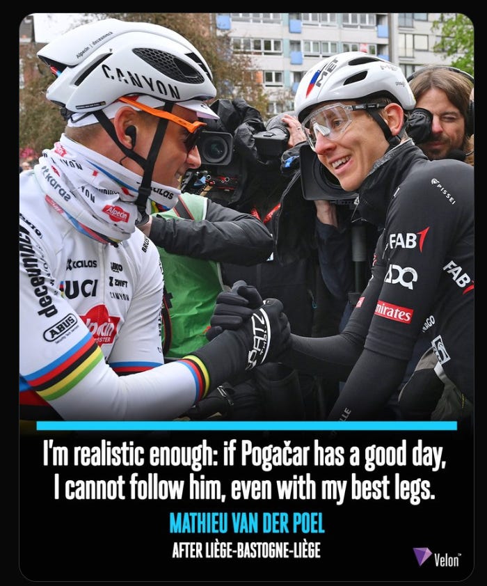 🚴 Three’s Company: It was a battle the cycling world had waited for - Tadej Pogačar vs. Mathieu van der Poel vs. Tom Pidcock. They were to duke it out in Belgium at the Liège-Bastogne-Liège, a one day race that’s been around since 1892. But for all the hype, we did not get a photo finish. With 100km remaining, a crash narrowed the field with Van Der Poel and Pidcock getting caught out of position so Pogačar took advantage and used his superior climbing talent to grab his 70th career win by more than 1 minute and 30 seconds. Read more…