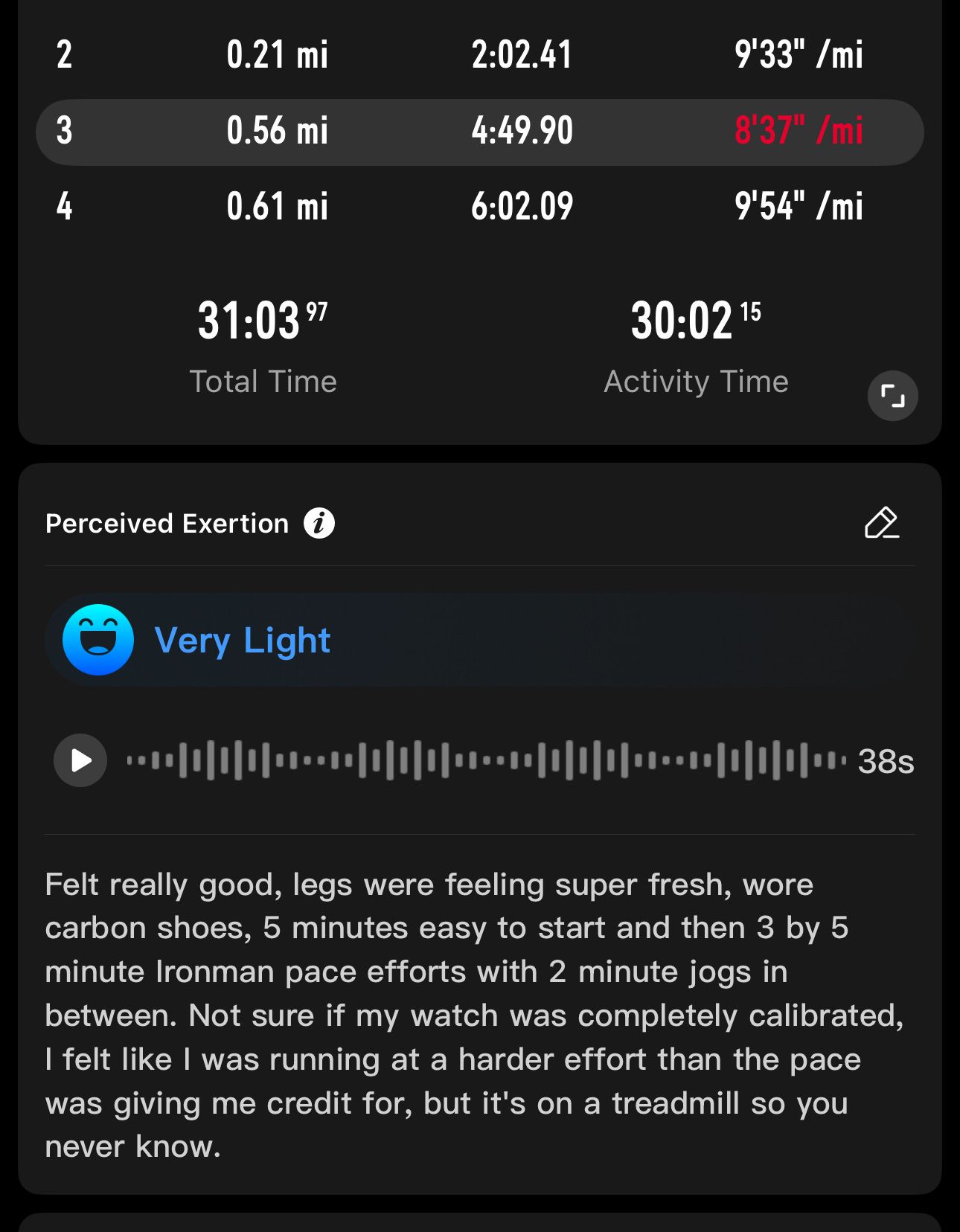 But the more I thought about it, the more it made sense. So after a long taper run, I finished the workout and recorded how it felt. I spoke for 23 seconds noting the legs are feeling fresh and my Ironman pace of 210 felt each and how I could maybe bump it up to 230.